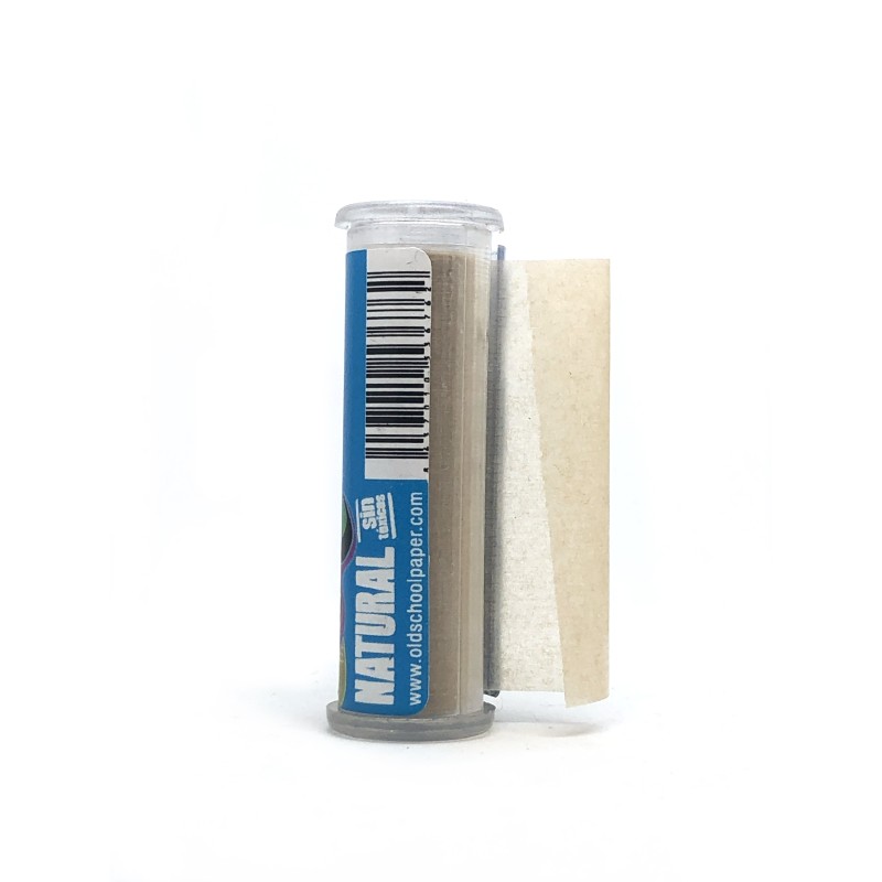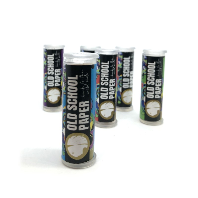 Concretamente, es un cilindro de plástico decorado con el logo de Old School. El envoltorio no llega a los 5 centímetros de largo, por lo que es cómodo de transportar y no ocupa demasiado espacio en el bolsillo. Además, su exterior es duro, lo que significa que no tienes que preocuparte por que el papel se doble o estropee. Está protegido de la humedad.